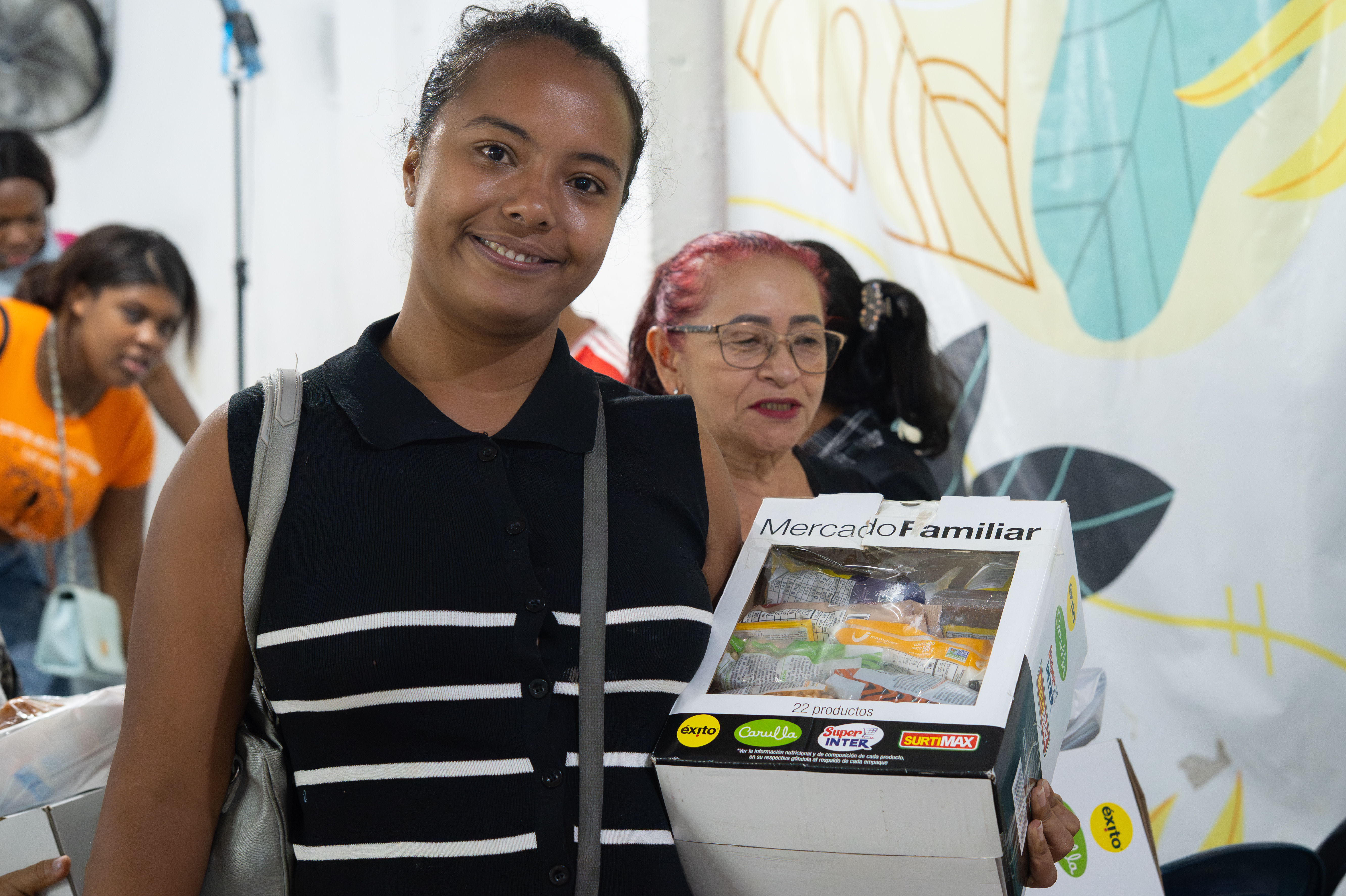 Manuela Orrego, recibe un mercado familiar como parte de la jornada solidaria que impactó a 35 familias en condición de vulnerabilidad en Medellín. Créditos: UCN Comunicaciones